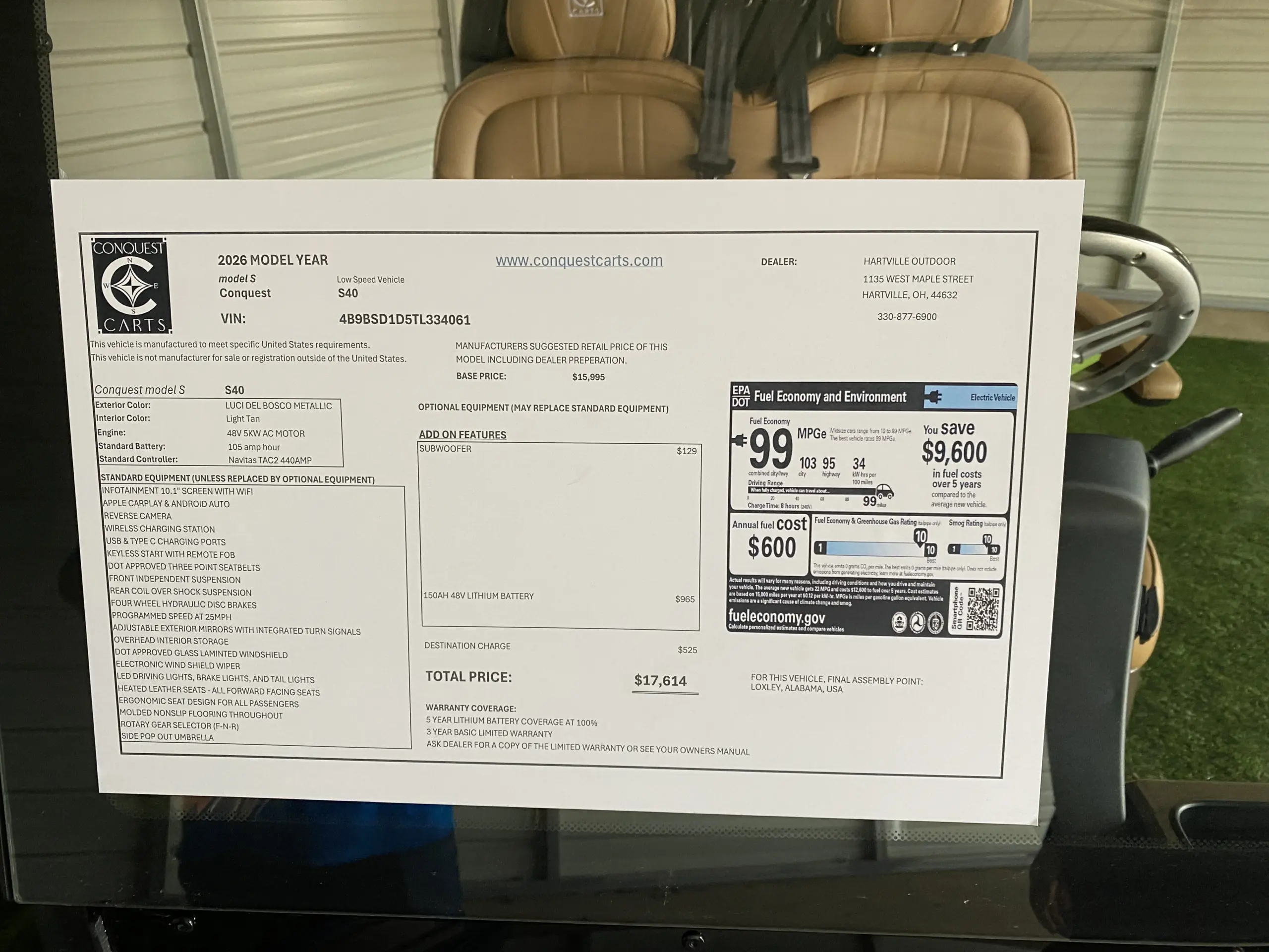 If you’re ready to own a Conquest S40 golf cart, our team at Hartville Golf Carts is here to help you make it happen. We provide clear pricing, expert recommendations, and a simple buying process designed around your needs. Whether you’re buying locally or out of state, we make it easy to secure the right cart with confidence.