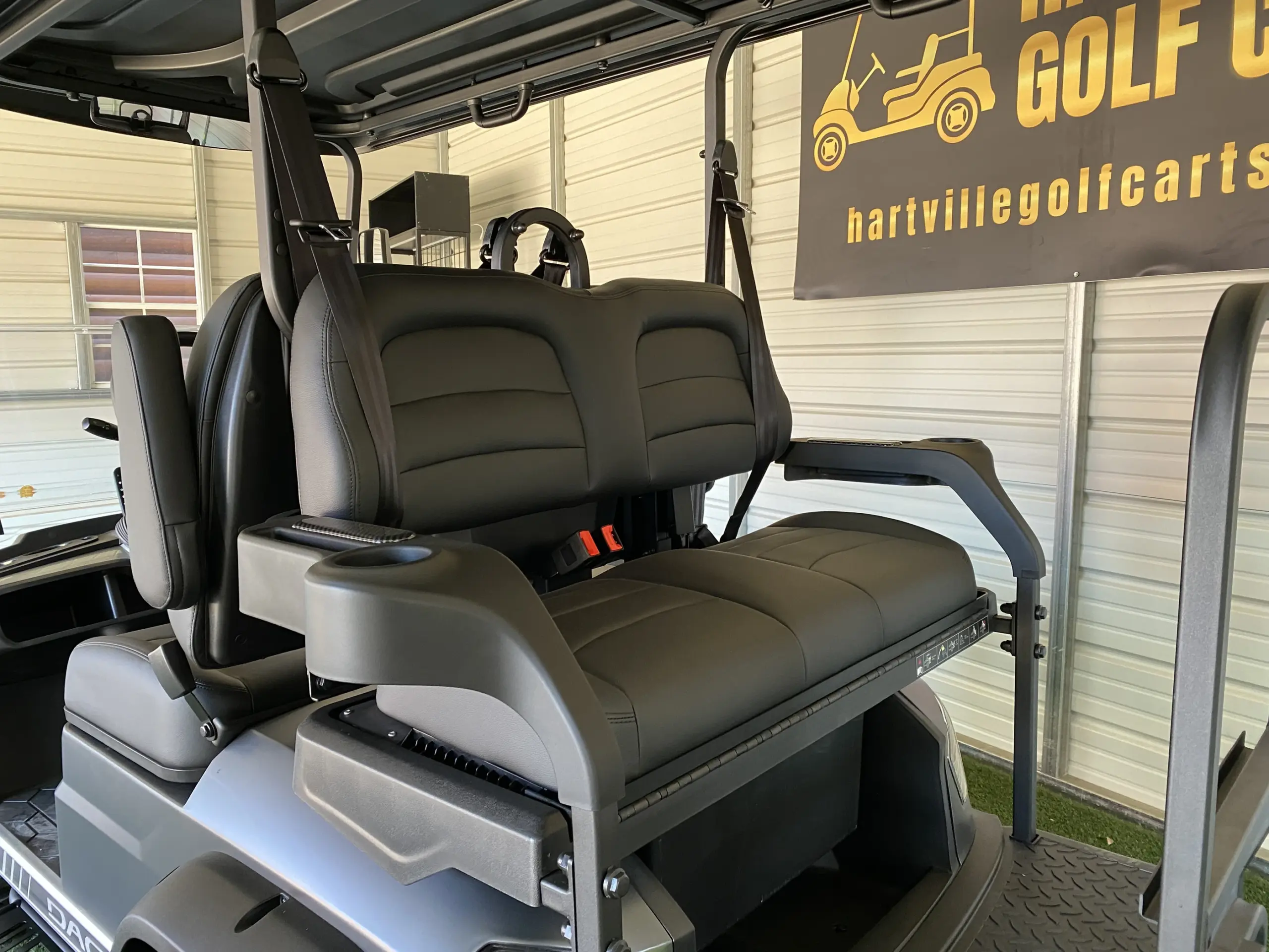 The 2+2 seating setup gives this cart a flexible layout that works well for small groups. The front seats feel like a traditional driving setup, while the rear seats add extra room without making the cart feel oversized. The Black interior keeps everything simple and clean, which pairs well with the Matte Gray exterior. This setup makes the cart feel well thought out instead of just functional.