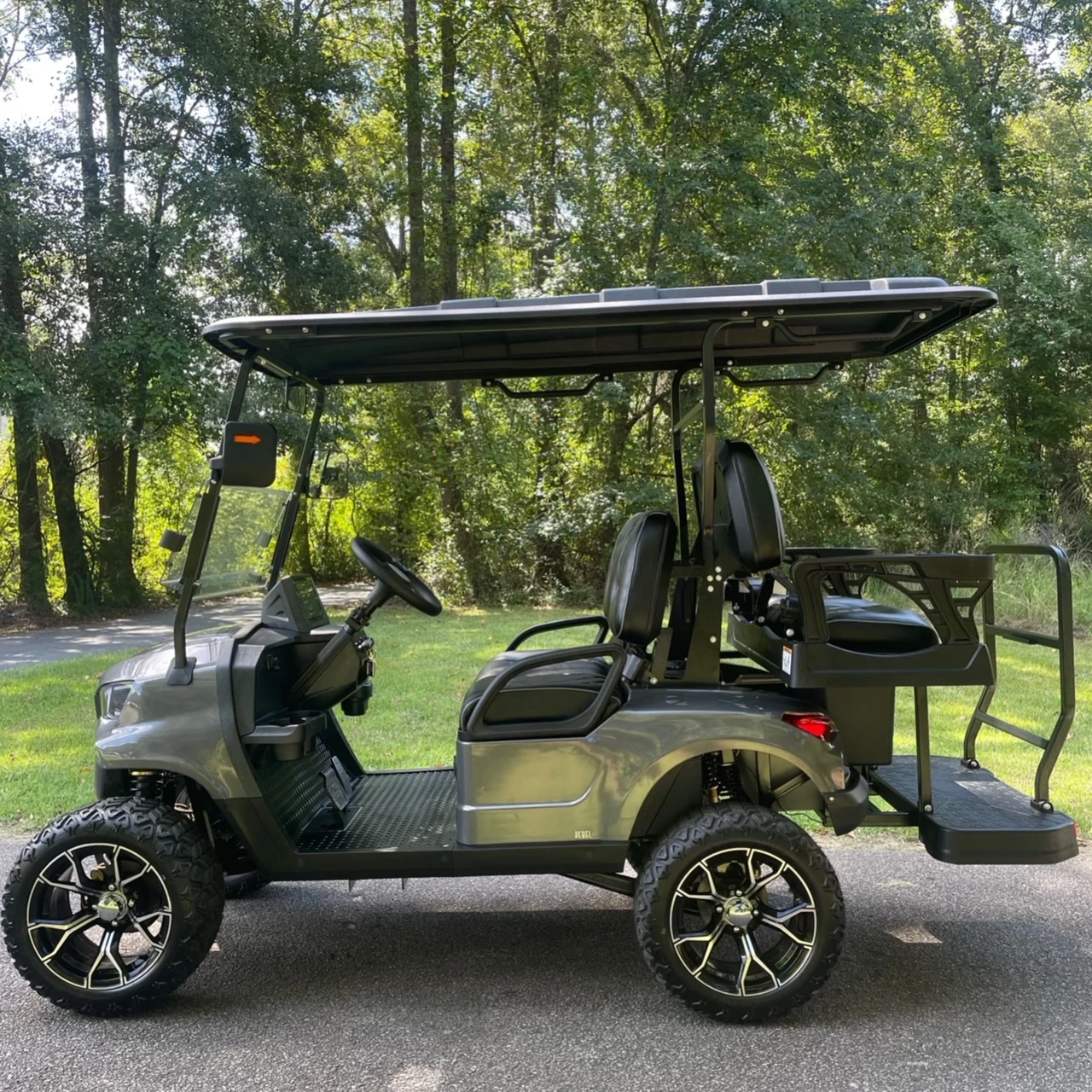 The wheel and tire combination is designed to handle everyday pavement use while offering the rugged look drivers expect from a lifted cart. The added height and aggressive styling contribute to a strong road presence, making the Rebel noticeable whether parked or in motion. This design also helps the cart navigate uneven surfaces more comfortably.